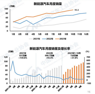 10月,新能源汽车产销分别完成98.9万辆和95.6万辆,同比分别增长29.2%和33.5%,市场占有率达到33.5%。2023年1月至10月,新能源汽车产销分别完成735.2万辆和728万辆,同比分别增长33.9%和37.8%,市场占有率达到30.4%。