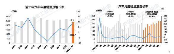 中国汽车工业协会数据显示,10月汽车产销分别完成289.1万辆和285.3万辆,同比分别增长11.2%和13.8%。汽车的产销量继9月后再创当月历史同期新高。2023年1月至10月,汽车产销分别完成2401.6万辆和2396.7万辆,同比分别增长8%和9.1%。