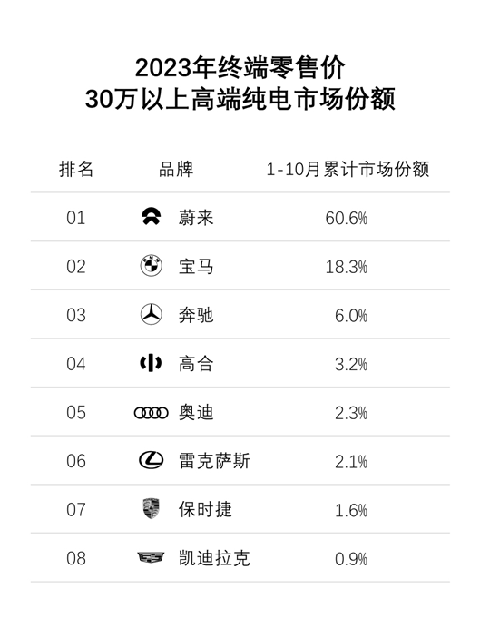 再聚焦来看终端零售价30万元以上的高端纯电市场。不难发现,在今年的前10个月,蔚来在该价格带的市场份额已达到60.6%,高端引领优势明显。宝马以18.3%的市场份额排在第二。显然,在“30万元以上”这个公认的高端纯电市场,蔚来不仅打破了传统豪华品牌BBA(奔驰、宝马、奥迪)构筑而成的传统梯队,还实现了绝对领先。按此趋势发展,蔚来的产品、技术和服务等形成的优势,将深刻影响该细分市场的走向。