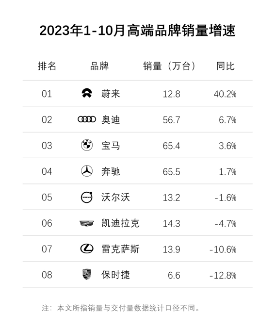 有统计数据显示了今年1-10月高端品牌的销量同比增速。其中,蔚来在今年前10个月的销量增速达到40.2%,排名居首。排在第二至第四位的分别是奥迪、宝马、奔驰,增速分别为6.7%、3.6%、1.7%,销量增速均远低于蔚来。二线豪华品牌如沃尔沃、凯迪拉克、雷克萨斯,销量增速为负值,分别为-1.6%、-4.7%,-10.6%。而保时捷则排在第8位,增速为-12.8%。