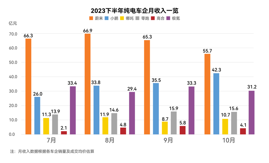 在收入方面,对比几家纯电新势力品牌在今年下半年以来的月度收入,蔚来同样占据领先地位。从7至10月各车企的月度收入来看,蔚来的月均收入已超过60亿元,比排名第二位的品牌高出一倍有余。而从7至10月各车企的总收入来看:蔚来的收入份额占据了40%,大幅领先;小鹏和极氪同样表现优异,分别占据21.6%和20%的收入份额。这意味着以蔚来、小鹏、极氪等为代表的新势力品牌,正在纯电市场上获得稳步发展。