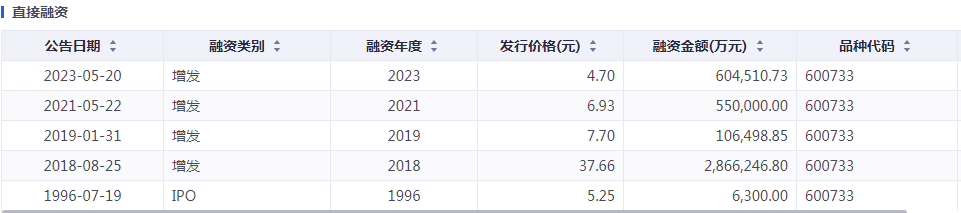 同花顺数据显示,上市以来,北汽蓝谷共进行了四次增发。最近一次是在2023年5月,北汽蓝谷以4.7元/股的发行价格发行12.86亿股,融资金额60.45亿元。2021年,北汽蓝谷还以6.93元/股的价格发行7.94亿股,融资金额55亿元。