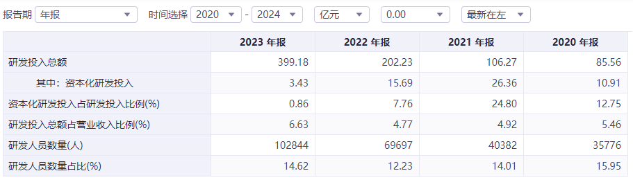 年报数据显示,截止2023年末,比亚迪研发人员数量达到102844人,研发投入总额近400亿,而资本化研发投入占研发投入比例仅为0.86%。2017年、2018年,比亚迪研发投入资本化率均超40%;2020年,研发投入86亿,资本化率也达到12.75%。
