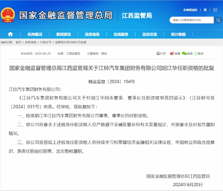 同时,江铃汽车财务公司新任董事长任职资格也获得江西监管局核准。