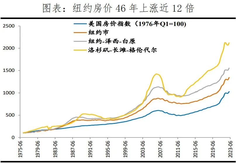 从国际经验看,优质房产价值具有穿越周期的稳定性,例如美国,1976年Q1-2023年Q2,美国、纽约市、纽约-泽西-白原分区(纽约都会区分区之一)、洛杉矶-长滩-格伦代尔分区(洛杉矶都会区分区之一)房价分别上涨9.3、12.4、14.5、20.2倍。