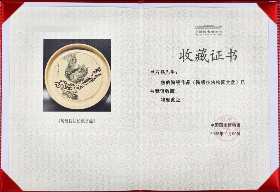 值得一提的是,《陶绣技法松鼠赏盘》不仅荣获奖项,还被中国国家博物馆选中收藏。国家博物馆作为最高历史文化艺术殿堂,其收藏证书无疑是对藏品极高规格的官方认可。此次作品被国博收藏,再次肯定了兰石磊的艺术成就和创新精神。