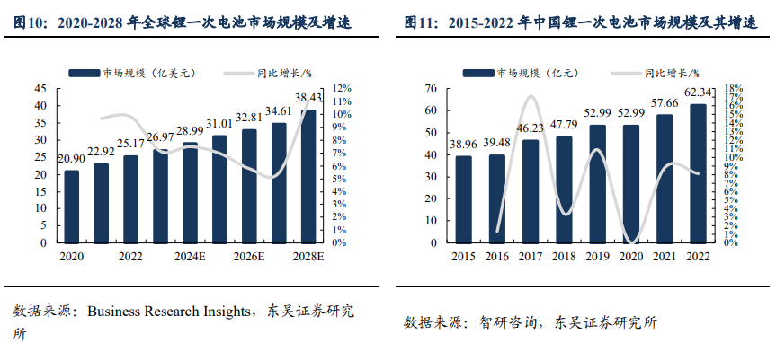 东吴证券研报预计,全球锂一次电池市场规模将保持逐年增长,预计2028年市场规模将达到38.4亿美元,2021年至2028年复合年均增长率为7%。
