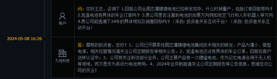 最值得称道的是,力佳科技子公司宜昌力佳2024年内2次牵头制定行业标准。2024 年 4 月宜昌力佳作为牵头起草单位编制的《锂原电池电池产品碳足迹评价导则(征求意见稿)》向社会发布并征求意见,并已形成报批稿。2024 年 9 月,宜昌力佳作为《宽温锂原电池》(国家标准计划号 20242918-T-607)国家标准牵头企业,联合行业内多家企业单位共同起草宽温锂原电池国家标准。
