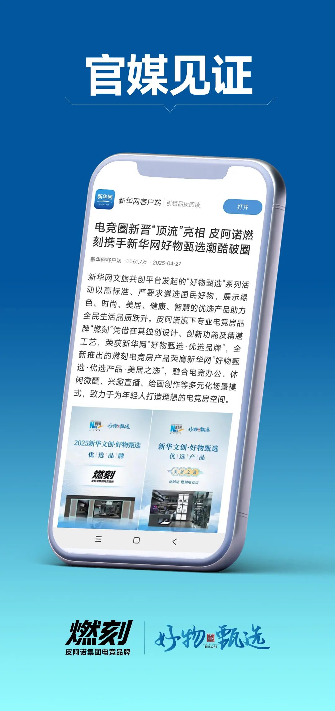 在信息爆炸的传播环境中,通过锚定权威平台建立信任支点,能高效构建起传播声浪。燃刻与新华网“好物甄选”深度合作,以国家级平台的公信力为产品价值背书。通过严格的产品性能测试与美学标准评估,燃刻电竞房一举斩获“优选品牌”与“优选产品”双项认证,更在世界品牌莫干山大会上荣膺「新华网·好物甄选品牌创新案例」,这不仅是对品牌创新发展的认可与激励,更是为其树立“美居+电竞”的行业标杆典范。