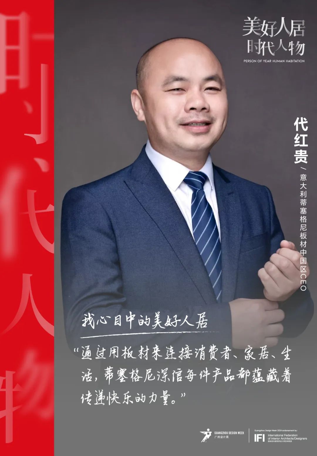 在“当代人居生活美学策源地”的发展愿景下,广州设计周携手家居新范式打造《美好人居时代人物》、《美好人居青年领袖》内容栏目,记录90+泛家居产业领军人物与先锋人物为满足人们对于美好人居生活的向往,而在材料技艺、空间业态、生活方式等方面所做出的策源创举和卓越贡献,深度探讨行业发展的新趋势、新未来、新模式。本期专访对话意大利蒂塞格尼板材中国区CEO代红贵先生,在板材的纹理与匠心中,探寻每件产品所蕴含的快乐基因,以及它向使用者传递的治愈力量。