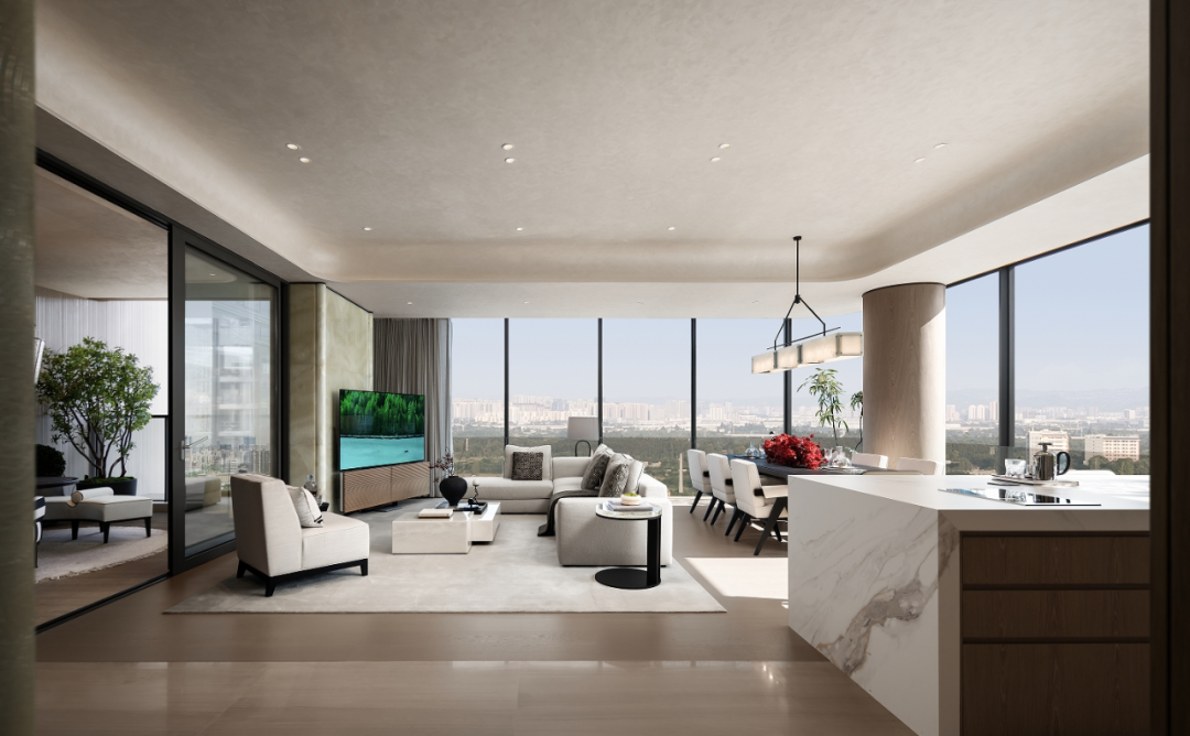 仁和春天·29号院独创“蝶形楼型”设计,建筑外轮廓法线错位排布,打破传统板式楼体限制,实现四面采光无遮挡;260㎡户型以三面全景舱构造(端厅+双端卧),搭配270°环幕采光面,不仅将自然光引入室内每个角落,使建筑本身成为光的雕塑;