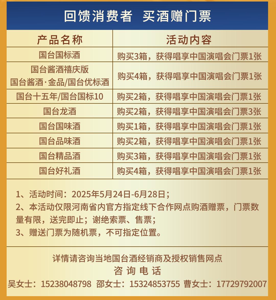 据了解,国台为回馈忠实的消费者,特别出台了买酒赠门票的相关活动:即日起到6月28日,购买国台指定产品,即可获得“唱享中国——智造好品质,通达美生活”音乐盛典门票。
