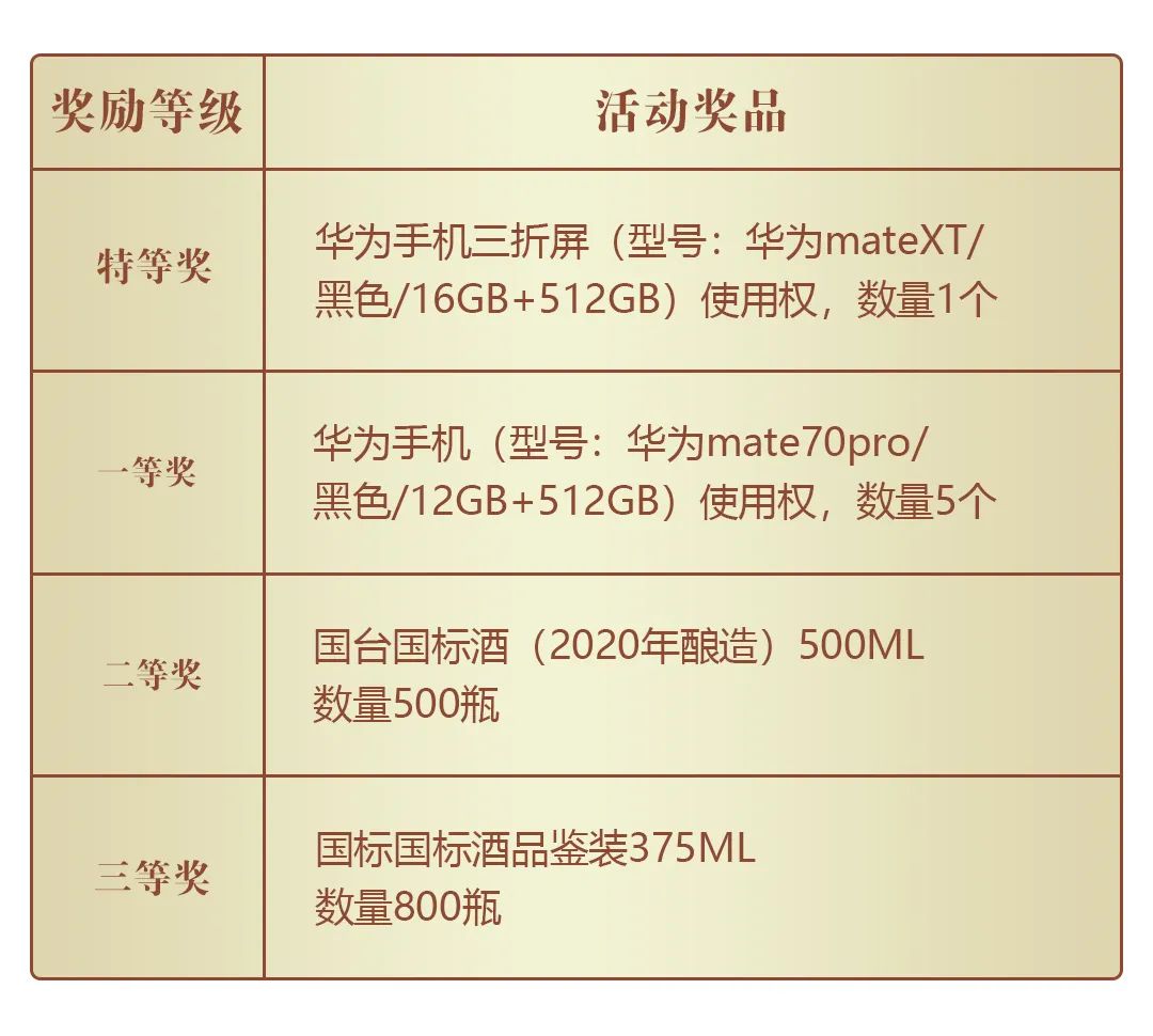从华为Mate XT三折屏手机,到品质美酒国台国标(2020年酿造);从大额消费券,到国台品鉴小酒的体验装……上万份奖品整装待发,不管你是刚进门的观众,还是坐在最后一排的“隐形幸运儿”,只要来了就能拥有!
