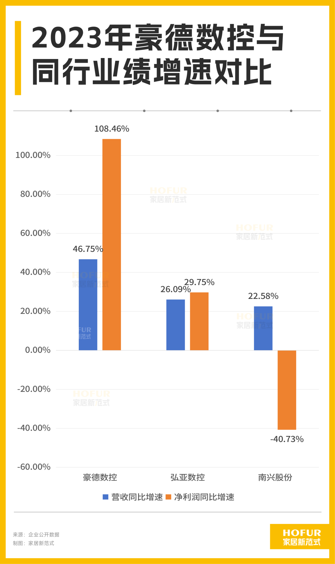家居新范式据此计算,2023年及2024年,豪德数控的营收同比增速分别为46.75%和-7.37%,净利润同比增速分别为108.46%和-8.54%。由此可见,公司2023年业绩增长迅猛;2024年业绩有所下滑,但是下滑幅度在同行中是相对较小的。