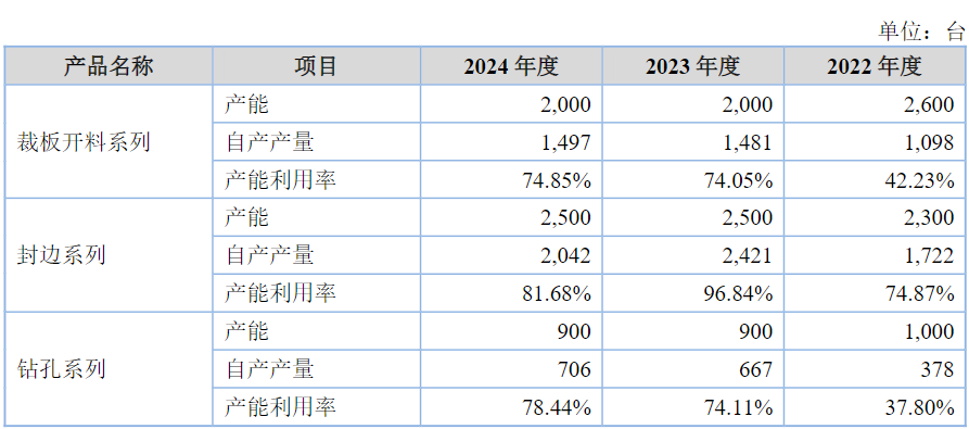 然而,家居新范式发现,豪德数控的产能利用率实际并未饱和。招股书显示,2024年,裁板开料系列产能利用率为74.85%,较2023年大抵持平;封边系列产能利用率为81.68%,较2023年下降约15个百分点;钻孔系列产能利用率为78.44%,较2023年有所提升。