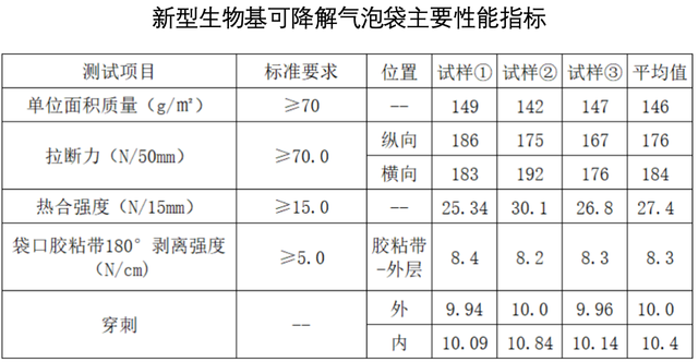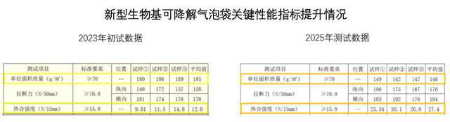 测试数据显示,采用了生物基可降解印刷复合膜材的新型气泡袋,其单位面积重量减少约20%,直接降低材料成本;同时热合强度提升约128%,性能远超国标要求。