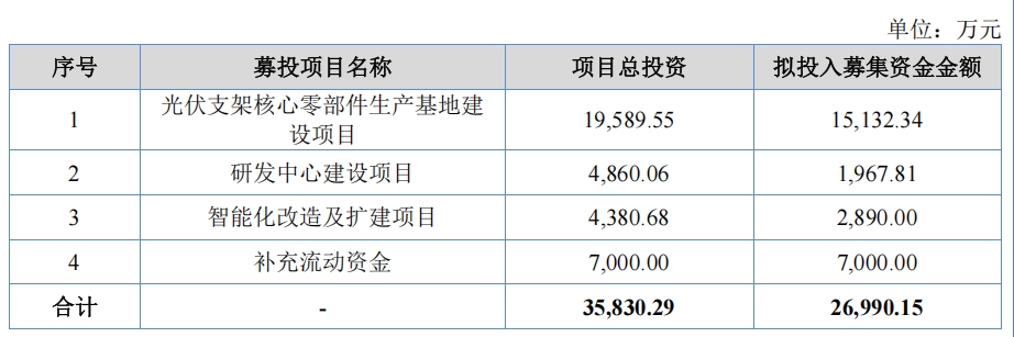 在招股书申报稿当中,酉立智能的募资金额为35830.29万元,在招股书注册稿当中,酉立智能的募资金额变更为26990.15万元。其中,光伏支架核心零部件生产基地建设项目拟募资规模由1.96亿元调减至1.51亿元;研发中心建设项目拟募资规模由4860.06万元调减至1967.81万元;智能化改造及扩建项目拟募资规模由4380.68万元缩减至2890万元。