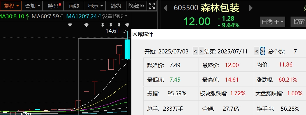 其中,7月10日,森林包装“有价格涨跌幅限制的日价格振幅达到15%”而登上龙虎榜。
