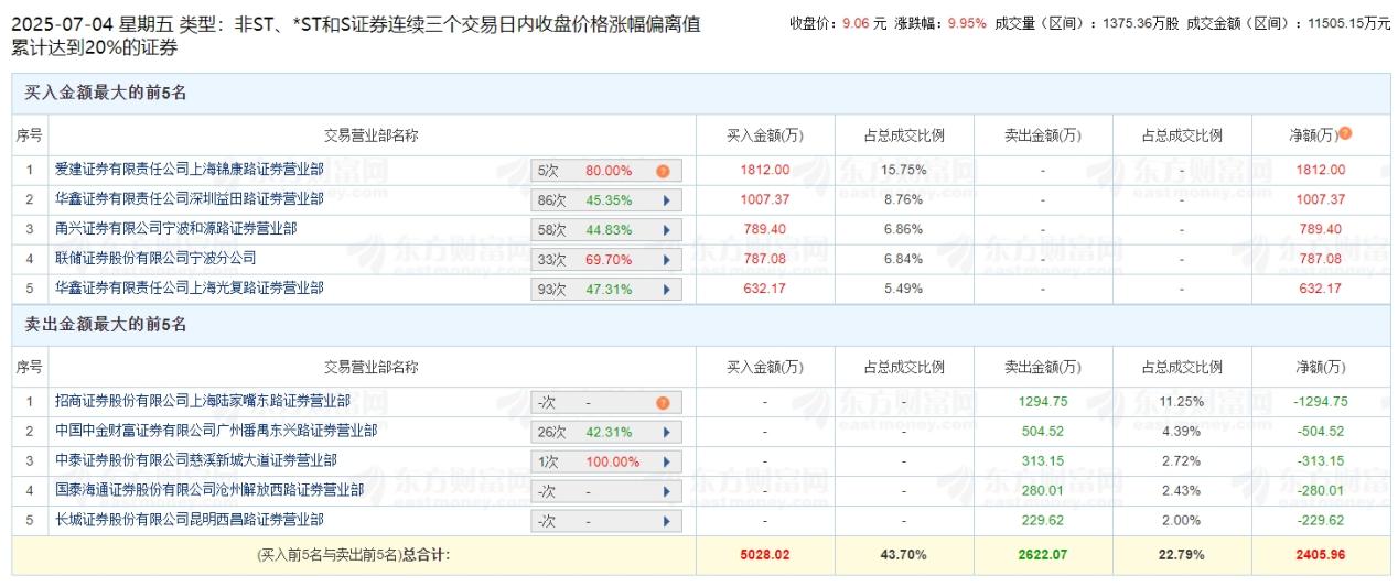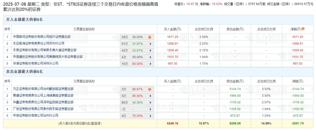 7月8日,因非ST、*ST和S证券连续三个交易日内收盘价格涨幅偏离值累计达到20%而登上龙虎榜。