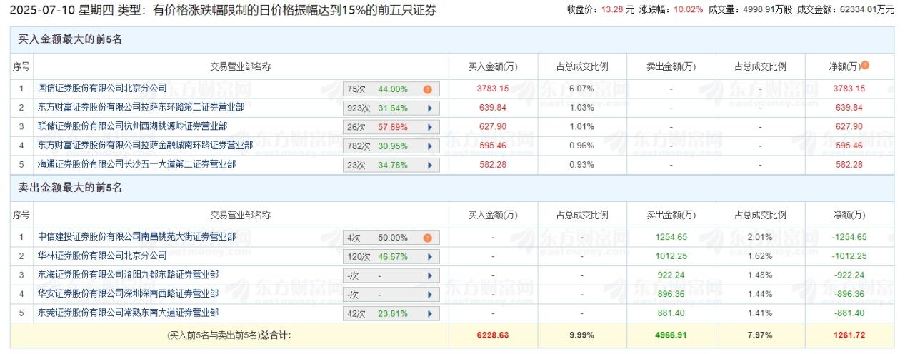国信证券北京分公司买入3783.15万元,东方财富证券拉萨东环路第二买入639.84万元,联储证券杭州西湖桃源岭买入627.90万元;中信建投证券南昌桃苑大街卖出1254.65万元、华林证券北京分公司卖出1012.25万元、东海证券洛阳九都东路卖出922.24万元。