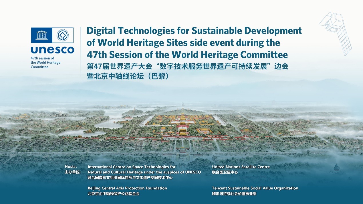 7月12日第47届世界遗产大会期间,在北京市文物局指导下,由联合国教科文组织(UNESCO)国际自然与文化遗产空间技术中心(HIST)、联合国卫星中心(UNOSAT)、北京京企中轴线保护公益基金会和腾讯可持续社会价值事业部在法国巴黎UNESCO总部举办“数字技术服务世界遗产可持续发展”边会暨北京中轴线论坛。