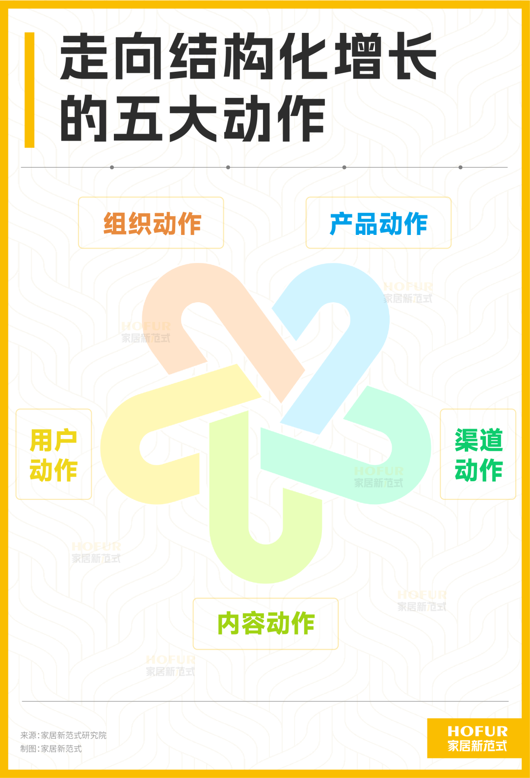究竟如何做?近两年的时间,家居新范式跟踪大家居企业围绕结构化增长做的一系列努力,总结出大家居企业实现结构化增长的五大动作:组织动作、产品动作、用户动作、渠道动作、内容动作。