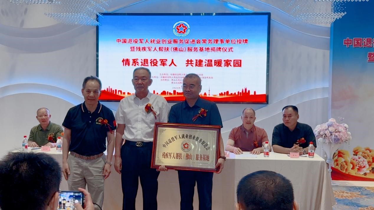 在激动人心的“授牌 + 揭牌”环节,王义将军亲自向老汇珠餐饮公司授予了“中国退役军人就业创业服务促进会常务理事单位”的荣誉牌匾。这不仅象征着社会力量与退役军人事业的深度融合,也为后续帮扶工作打下了坚实的基础。老汇珠餐饮公司相关负责人表示,作为一家扎根佛山的企业,老汇珠餐饮长期无偿提供办公与培训场地,支持残疾军人帮扶(佛山)服务基地运营,为退役军人及残疾人打造了一个稳定、温暖的“家”,希望通过实际行动回馈社会。