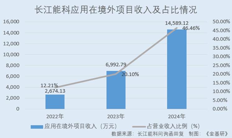 2022-2024年,长江能科境外项目收入分别为2,674.13万元、6,992.79万元、14,589.12万元,占营业收入比例分别为12.21%、20.10%、46.46%。