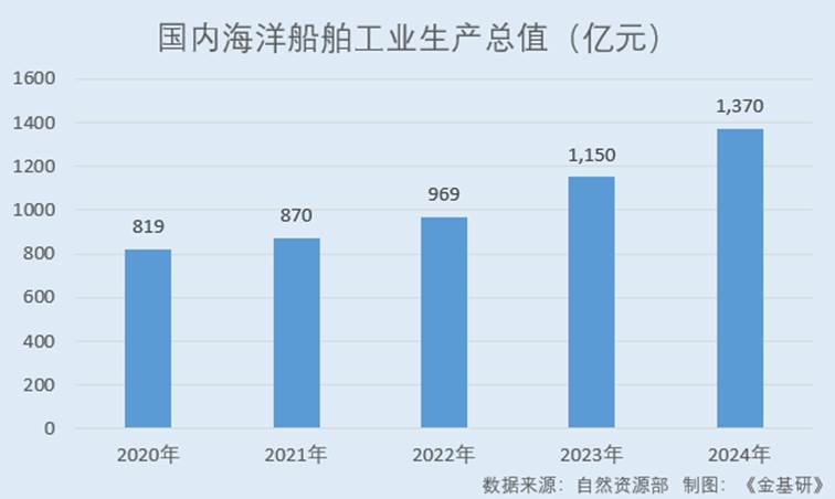 据自然资源部数据,2020-2024年,国内海洋船舶工业生产总值分别为819亿元、870亿元、969亿元、1,150亿元、1,370亿元。