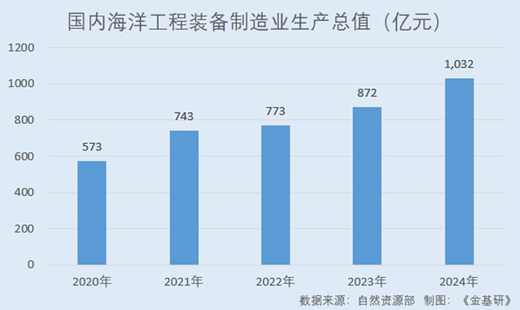 据自然资源部数据,2020-2024年,国内海洋工程装备制造业生产总值分别为573亿元、743亿元、773亿元、872亿元、1,032亿元,CAGR达15.85%。