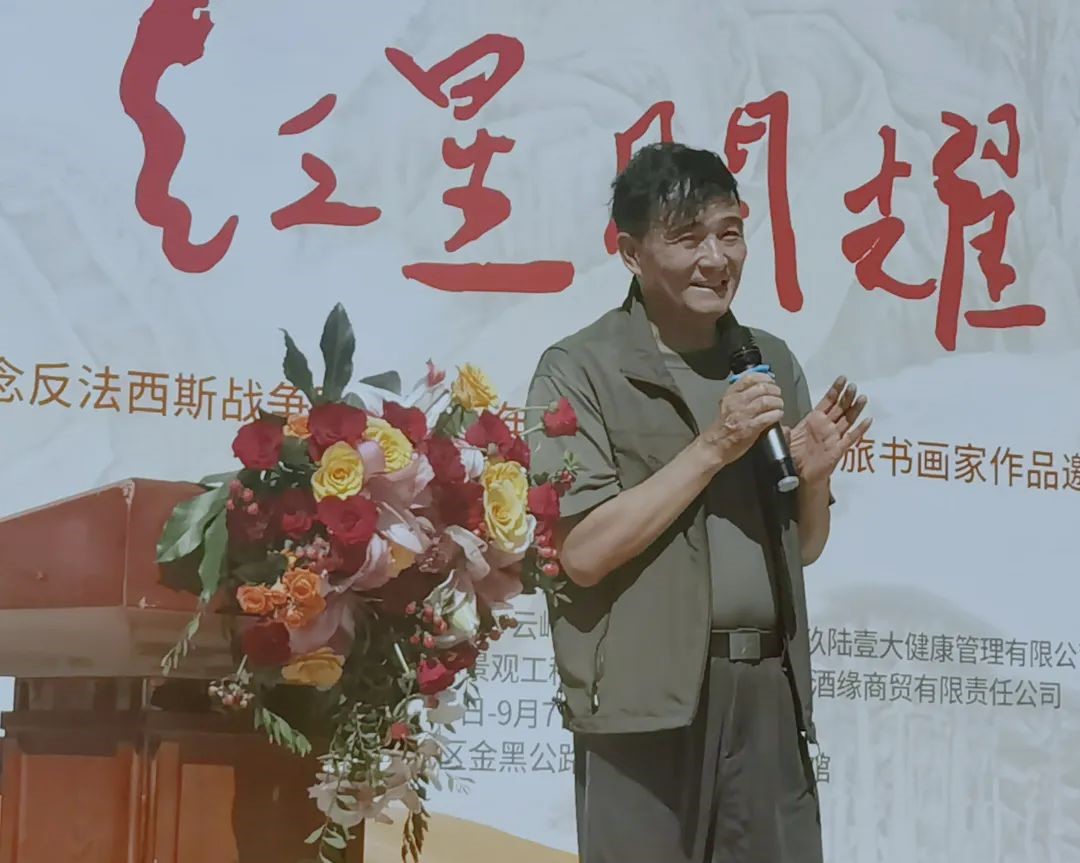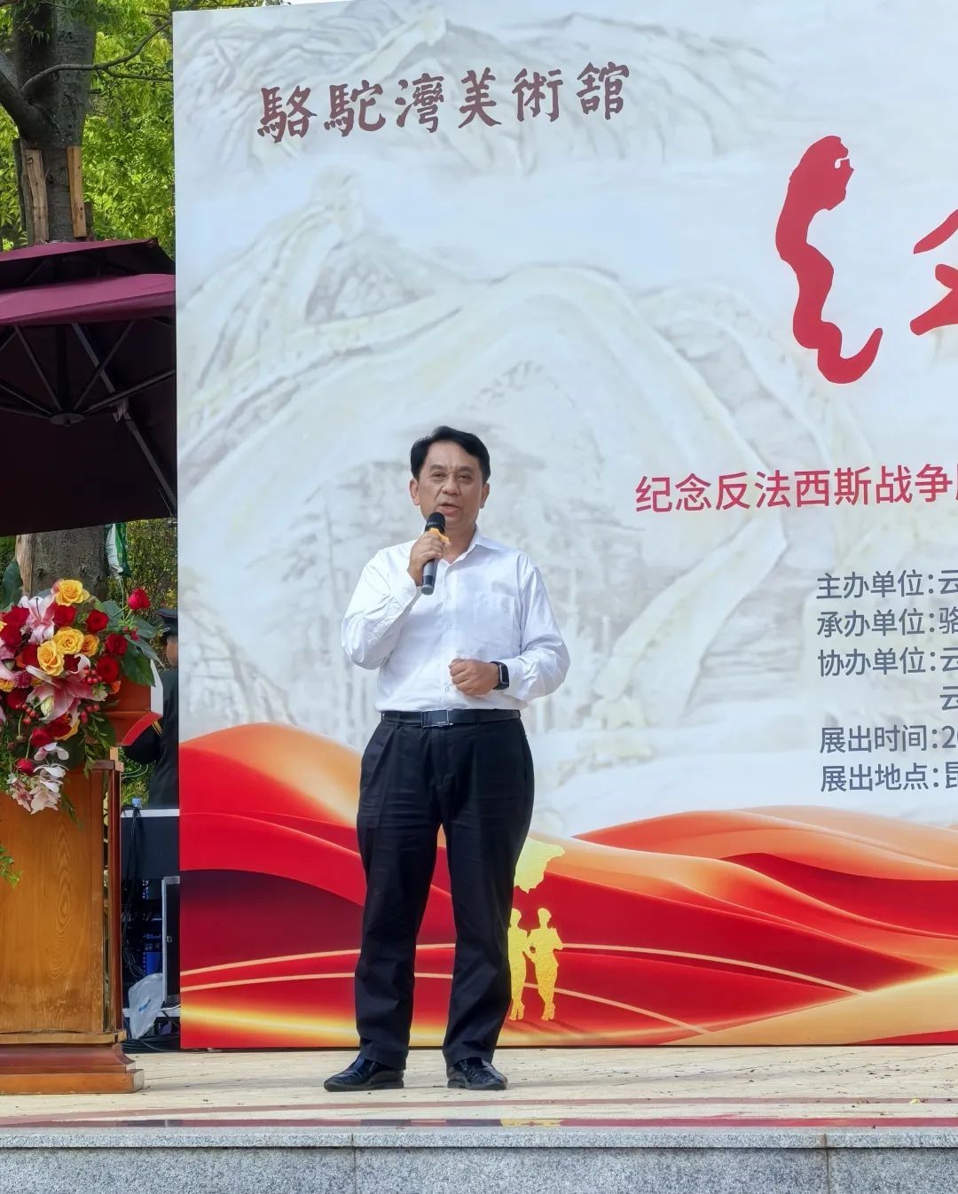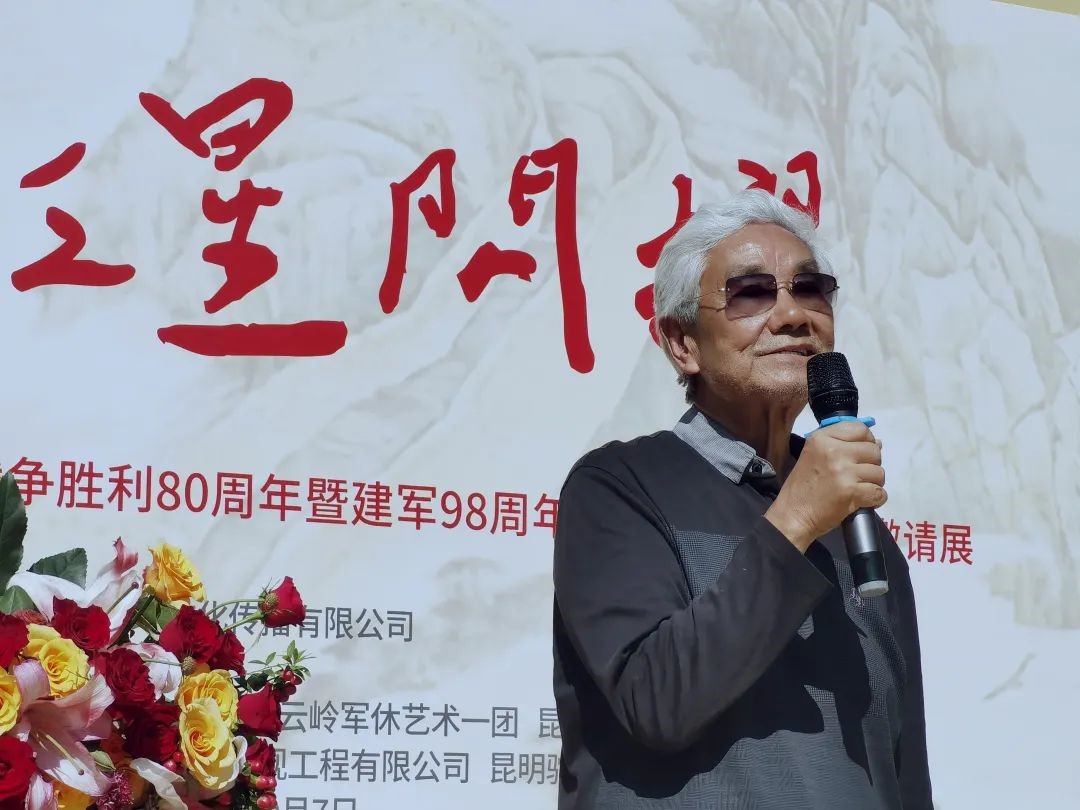 云南省文联原党组书记、主席郑明先生在致辞中,首先感谢了出身军人世家的李丽荣女士倾力承办此次意义非凡的画展。他高度评价了本次展览的高规格与独特价值,指出参展的七位将军和十一位书画家阵容强大,作品艺术水准卓越,其中钟开天、李如、于克敏等艺术家的多件作品曾荣获全国全军大奖。他强调,此展是为纪念世界反法西斯战争胜利80周年和中国人民解放军建军98周年而举办,旨在深情歌颂伟大祖国和人民军队,深切缅怀革命先烈,大力弘扬伟大的抗战精神,意义非凡。