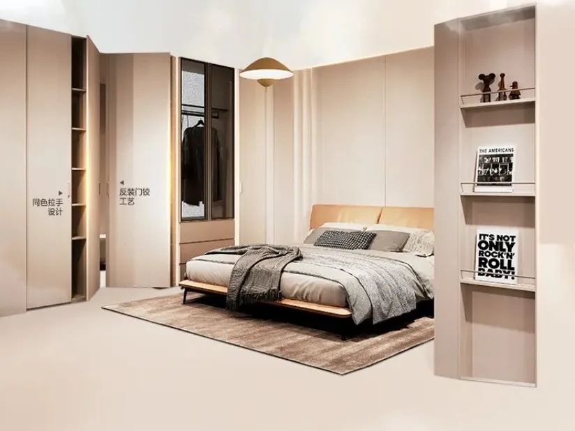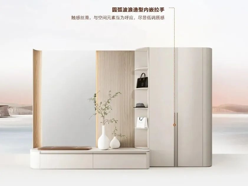 设计特点:月白与雾灰白交织呼应;弧形美学打造精致感,圆弧设计元素贯穿全系列,在圆润的曲线之间感受精致与悠闲;材质采用意式水性半透木皮涂装技术。