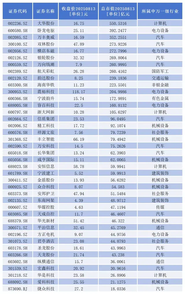 截至8月13日收盘,40家浙江上市公司中,总市值超过百亿的一共有14家,分别是大华股份、卧龙电驱、万丰奥威、双林股份、横店东磁、银轮股份、万向钱潮、航天彩虹、韵达股份、海南华铁、震裕科技、宁波韵升、容百科技、浙大网新。