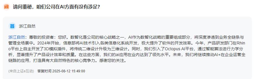 “AI就是生产力。”浙江自然(605080)研发总监黄总用这样的开场白展开了与《览富财经网》的对话。