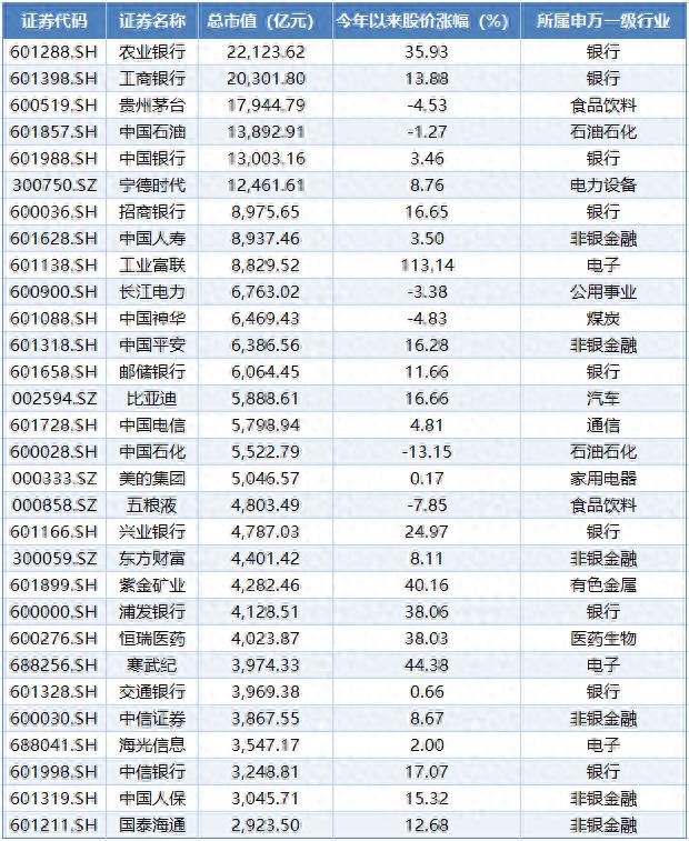 具体到公司方面,截至8月18日收盘,农业银行位居A股市值榜首位,达到2.21万亿元。紧随其后的是工商银行和贵州茅台,A股市值分别为2.03万亿元和1.79万亿元。此外,中国石油、中国银行、宁德时代分别排在第四至第六位,上述公司A股市值均超过万亿元。