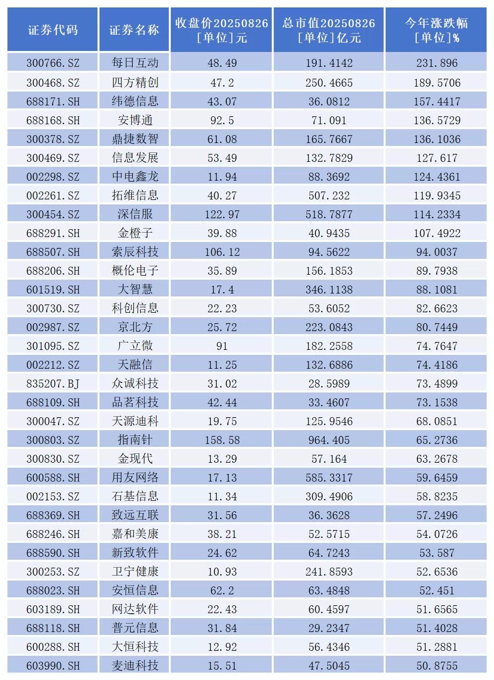 每日互动、四方精创、纬德信息、安博通、鼎捷数智、信息发展、中电鑫龙、拓维信息、深信服、金橙子10家公司已经成功实现翻倍。