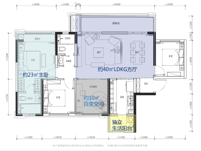 建面约130㎡四房户型,强调改善属性,同样是横厅设计,双阳台,有独立玄关,搭配面宽约6.8米的景观阳台,整个厅的尺度更为阔绰,约40㎡,达到了市面上140㎡户型的空间尺度。而且除10号楼外,其余所有全部朝向中庭,静谧安宁与温暖阳光皆可得。