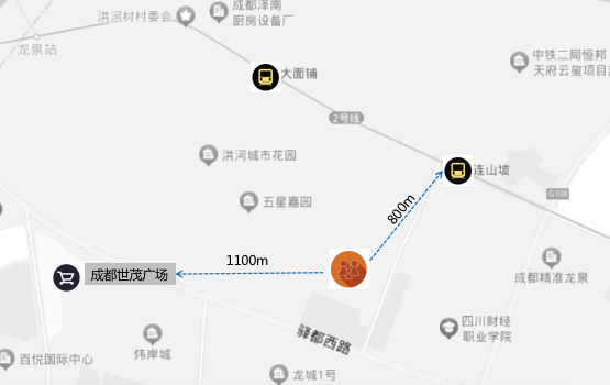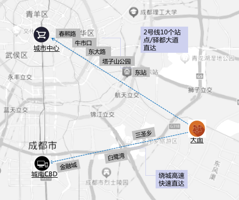 以大面便利的交通基底,2号线快速换乘1/7号线,或换乘地铁9号线2期(规划中);驾车由成龙立交上绕城高速,24分钟即可抵达高新区金融城(百度地图实时测绘显示结果)。