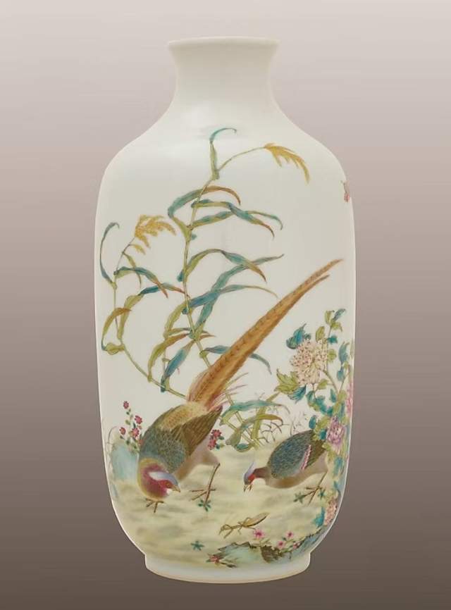 “锦鸡洞石花卉灯笼尊”,高度26厘米、腹径13.5厘米、口径5.6厘米、足径8.3厘米,落“大清雍正年制”楷书六字款。画面构图为锦鸡、芦苇、牡丹、奇石。画面丰富,层次较多。锦鸡一雄一雌,在花丛中准备捉一螳螂,雄性锦鸡正在回首相望,情趣盎然;所绘芦苇似在风中摇曳,叶子的色彩异常丰富,显示宫中画师高超的绘画水平;锦鸡羽毛笔触极为精细,色彩变化层次丰富,表现力十分强有力。画面题字为“嫩蕊包金粉,重葩结绣云”,五言诗文,引手印“佳丽”,落款印章为“金城”“映旭”。