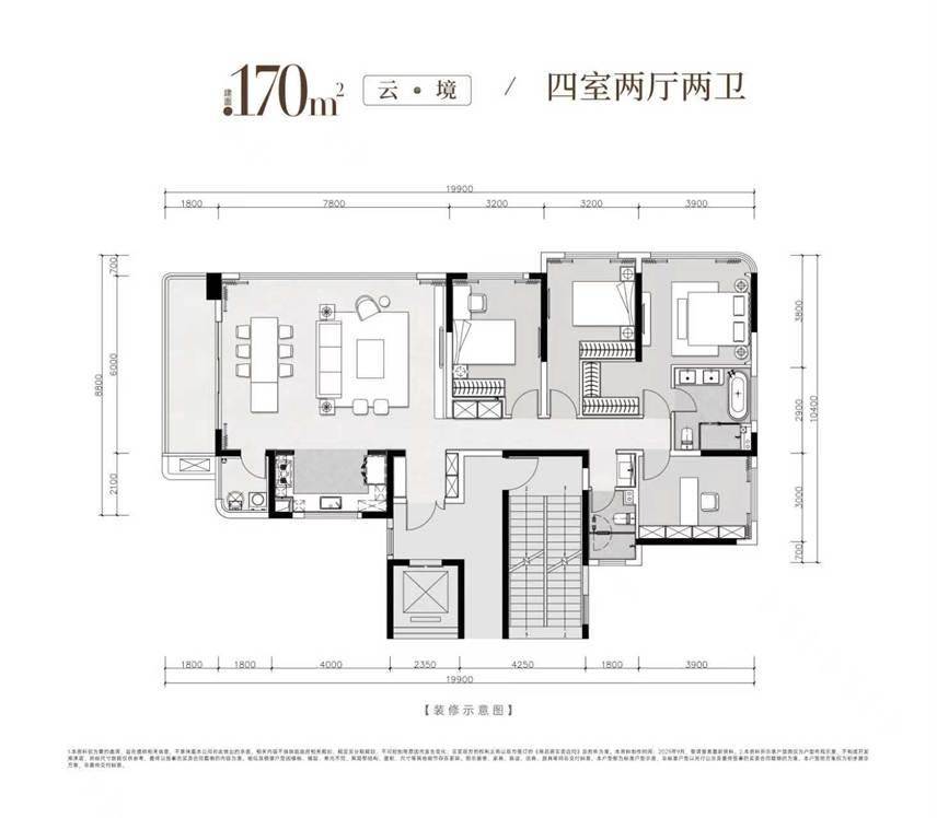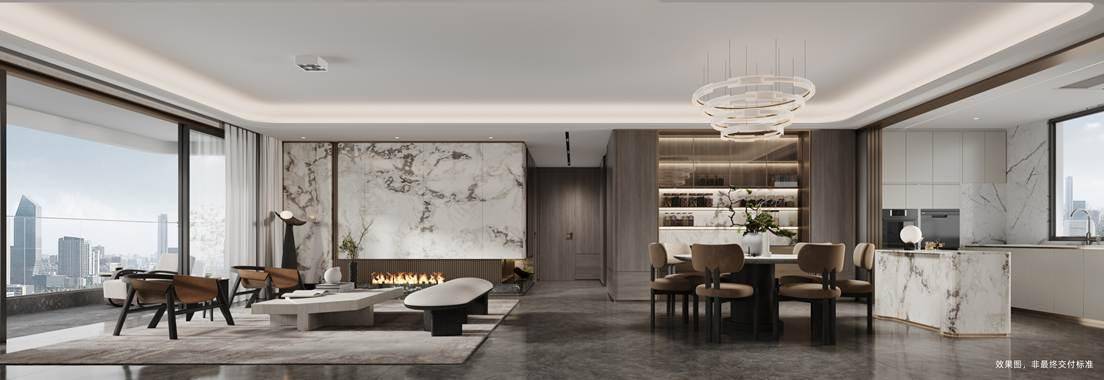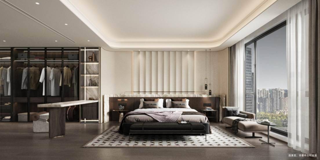 建面约170-230㎡全精装四房产品,坚持空间平权与舒适优先原则:C字型楼栋布局实现270°观景视野,端厅+宽幕阳台设计将阳光与园景引入室内,LDKG一体化格局放大公共活动空间;双主卧套房配置独立卫浴与衣帽间,满足多代同堂或高端客群的私密需求。