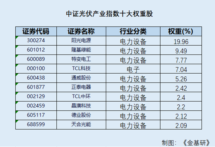 中证光伏产业指数汇集了A股光伏产业链上、中、下游的众多细分龙头,产业属于技术密集型,高新技术企业占比高。该指数前十大权重分别为阳光电源、隆基绿能、特变电工、TCL科技、通威股份、正泰电器、TCL中环、晶澳科技、德业股份、天合光能。