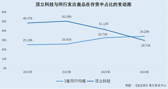 2021-2024年,顶立科技3家同行存货中发出商品的占比均值分别为25.19%、25.91%、32.73%、34.2%。