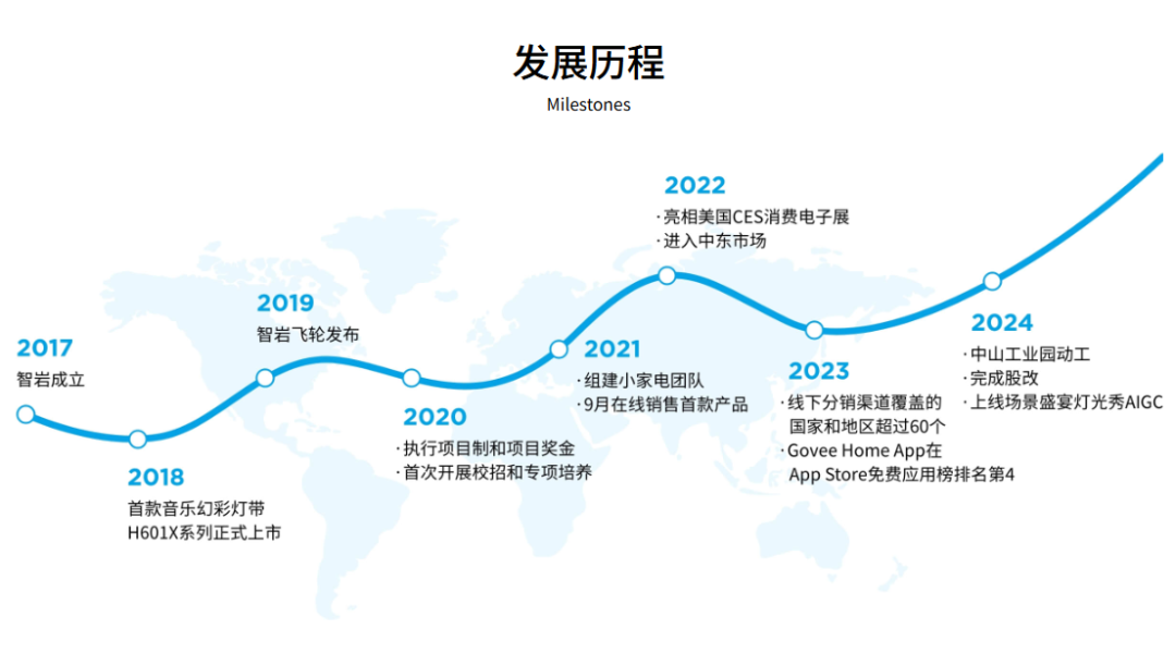 智岩科技在创立之初,就锚定了智能照明赛道。其主要销售氛围灯条、室内外场景灯等装饰性照明,配合物联网、人工智能、大数据等技术,实现智能化控制,营造出不同的环境氛围。