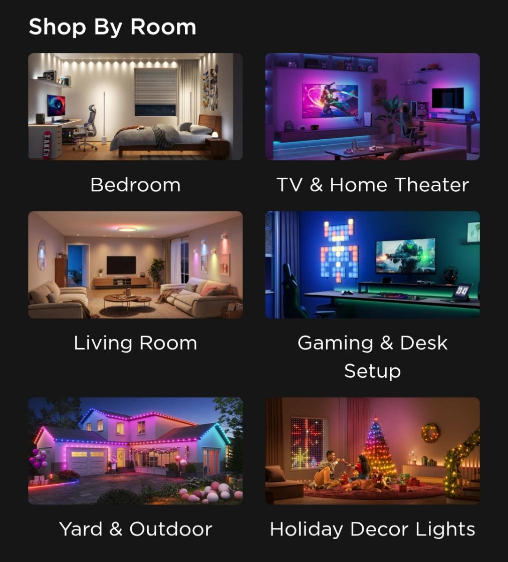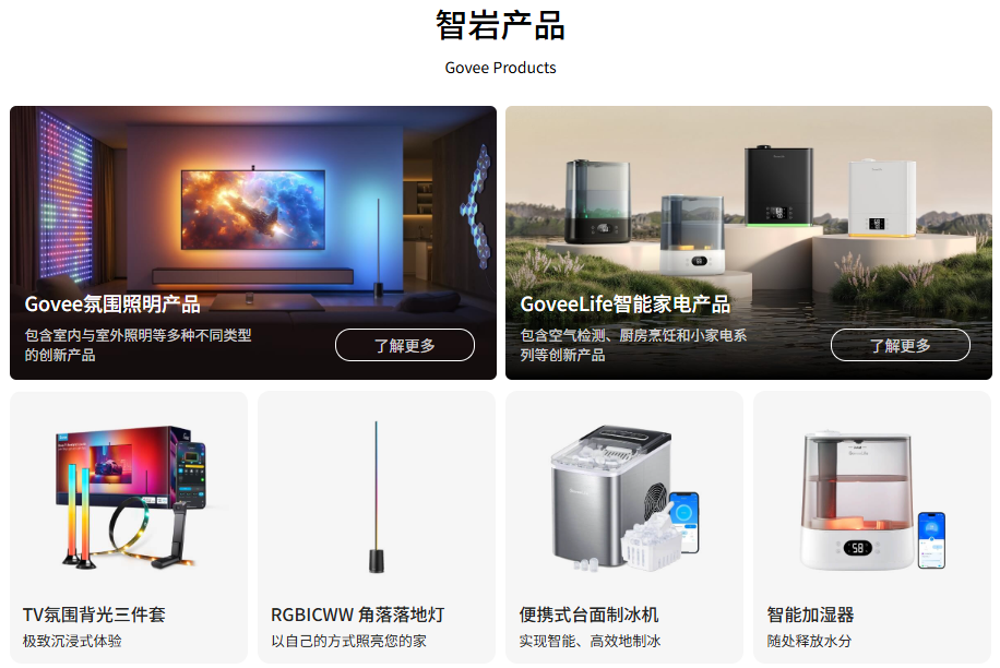 此外,智岩科技还进行场景开发和营销。据Govee独立站,其按照不同场景进行产品规划,分别有卧室、电视和家庭影院、客厅、游戏和桌面设置、庭院和户外、节日装饰等多种场景,方便消费者购买。