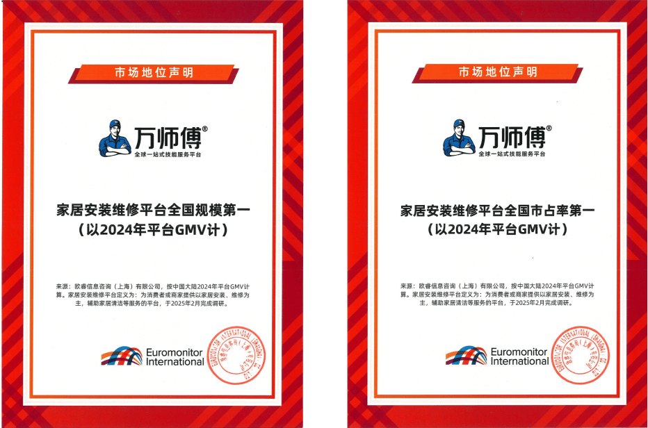 在权威调研机构欧睿国际发布的专项声明中,万师傅已以绝对优势拿下家居安装维修平台“全国规模及市场占有率双第一”的头衔(以2024年平台GMV计)。而它,也仅仅是一家创立才12年的平台。