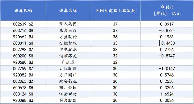 另据同花顺数据,登榜次数超过30次的个股有塞力医疗、雪人集团、方盛股份、合锻智能、中电鑫龙、广道退、退市苏吴、方正阀门、科力股份、四川金顶、江南新材、永安药业、天际股份。其中,塞力医疗与雪人集团登榜次数最多,且同样为37次,方正阀门、科力股份、四川金顶、江南新材、永安药业、天际股份均为30次。