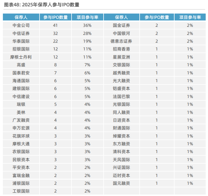 伴随市场活跃,部分中介机构的竞争格局进一步向头部集中。保荐业务方面,中资机构优势显著,中金公司以41家项目蝉联榜首,中信证券、华泰国际紧随其后。审计业务仍由“四大”主导,安永以41家项目升至首位。