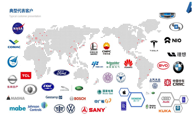 截至2025年上半年,公司积极拓展海外市场,境外收入同比增长超过60%,累计服务终端客户数千家,经销商及销售与技术支持团队遍布主要国家和地区,为航空工业集团、中国商飞、比亚迪、一汽大众、宁德时代、上汽大众、上汽通用、特斯拉、中联重科、徐工集团、中兴通讯等知名企业,以及中国科学院空间应用工程与技术中心、中国科学院微电子研究所、清华大学、浙江大学、南京航空航天大学等研究机构院所提供前沿技术方案。