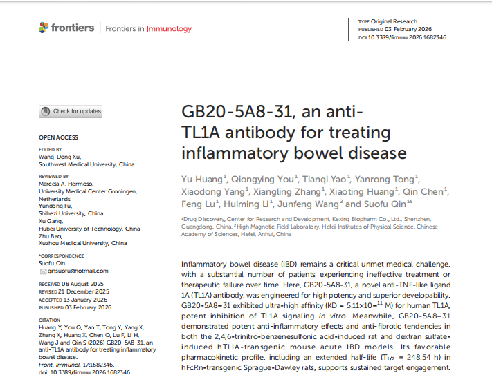 近日,科兴制药(688136.SH)自主研发的创新药项目GB20(TL1A)研究成果发表于国际知名免疫学期刊《Frontiers in Immunology》,该期刊为国际免疫学会联盟(IUIS)的官方期刊。