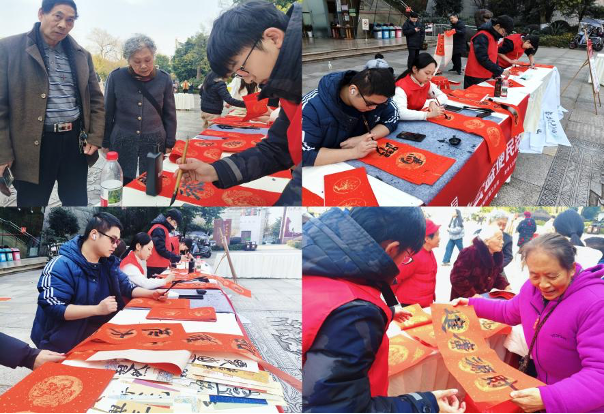 此外,团队与书法协会联动开展的“翰墨迎春·暖心邻里”活动。活动现场,志愿者们书写近300幅春联与“福”字,红纸铺展、墨香弥漫,吸引众多居民驻足参与。一幅幅满载祝福的春联,映衬着老人与孩子们灿烂的笑颜,让传统年味在笔墨间热烈绽放,更将真挚的关怀与陪伴深深融入社区的日常脉搏之中。